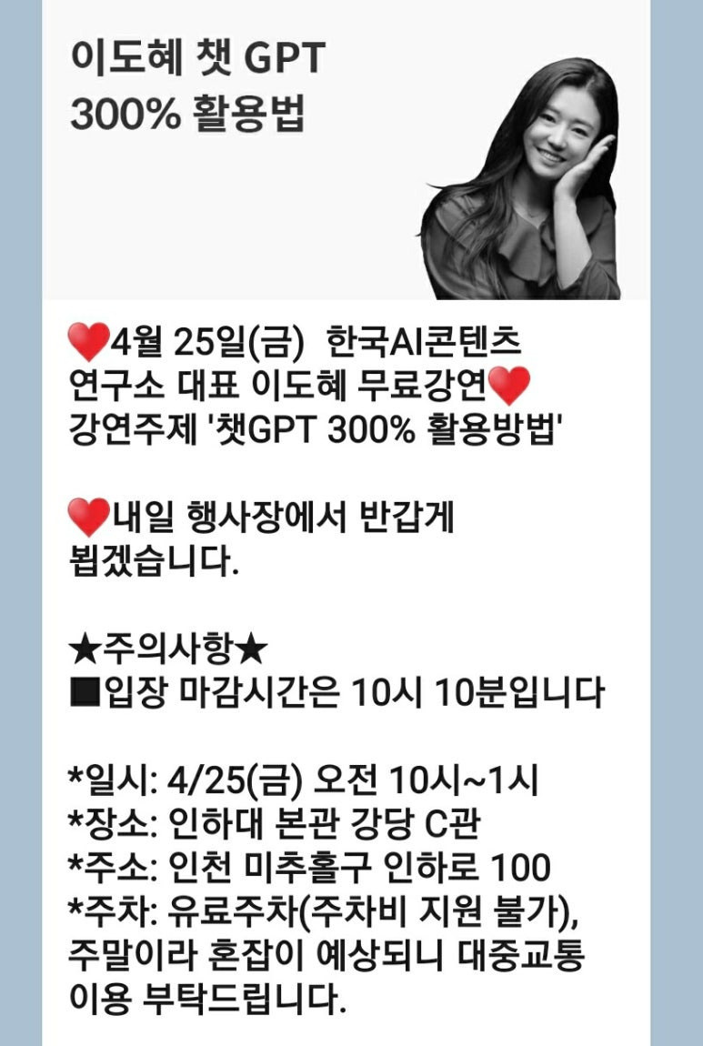 얼마 전 다녀온 이도혜 강사님의 '챗GPT 300% 활용방법' 무료강연 후기를 남겨보려고 한다.